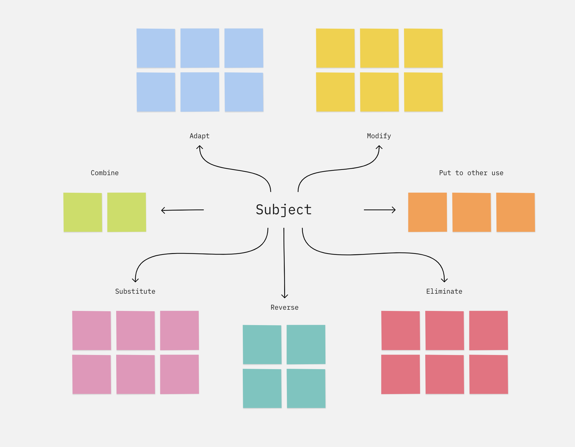 Jeśli tradycyjna burza mózgów nie działa na Ciebie, spróbuj użyć technik stworzonych specjalnie do pobudzania kreatywności, takich jak mind mapping czy SCAMPERing. Poniżej przykłady z programu Miro.